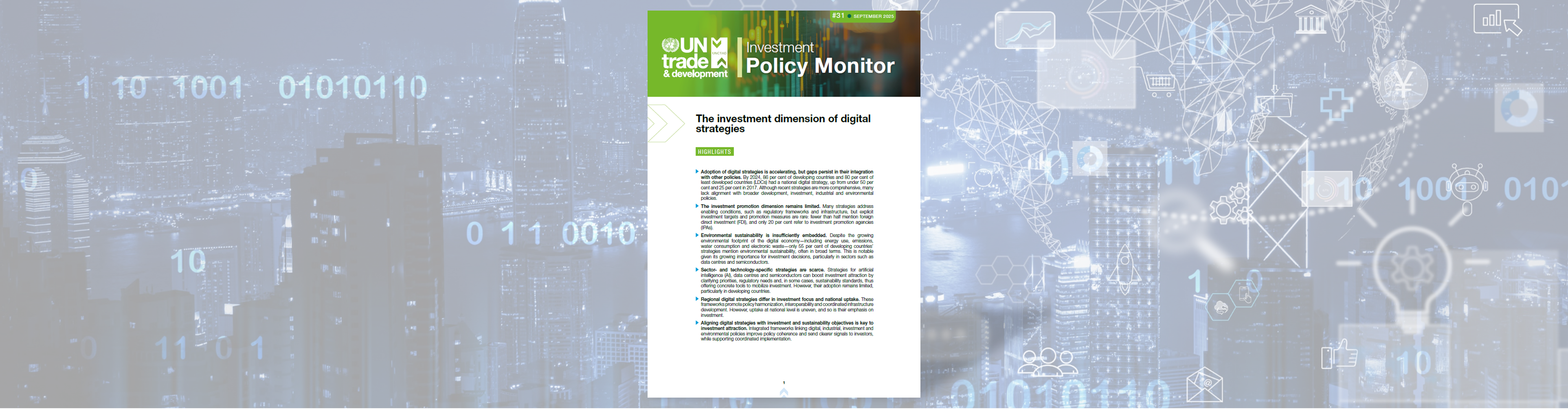 The digital economy is expanding rapidly, but investment remains uneven and key policy gaps persist. The latest Investment Policy Monitor builds on and expands the analysis of the World Investment Report 2025, examining the investment dimension of digital strategies. It reviews regional, national and sectoral initiatives and identifies common challenges in turning these strategies into effective instruments for mobilizing international investment in digital transformation.